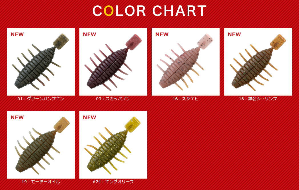 | カラー | 全6色(グリーンパンプキン、スカッパノン、スジエビ、無名シュリンプ、モーターオイル、キングオリーブ) |