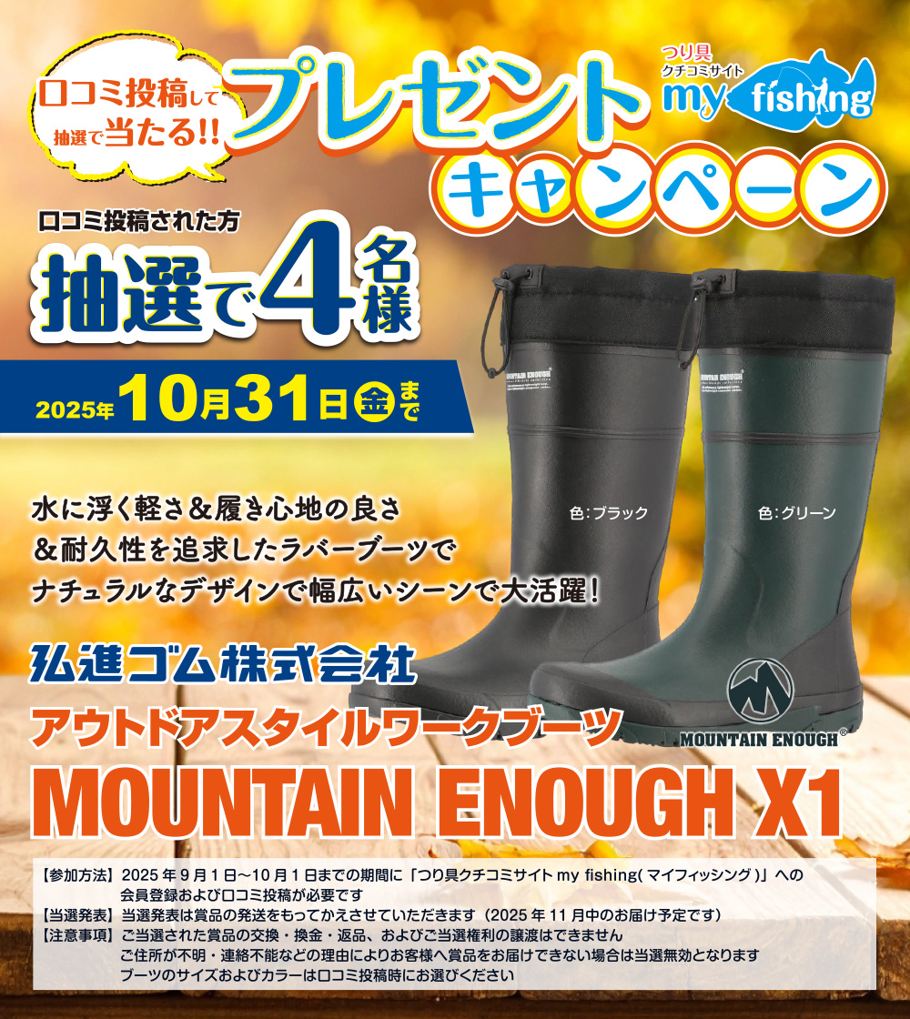 9/1~10/31の期間中、つり具クチコミサイトmyfishing(マイフィッシング)にてお持ちの釣具の口コミ(レビュー)投稿をしていただいた方の中から抽選で4名様に、1935年創業の長靴やレインウェアを製造する弘進ゴム様よりご協賛いただいた、オリジナルブランド【MOUNTAIN ENOUGH】のアウトドアスタイルワークブーツ「MOUNTAIN ENOUGH X1」をプレゼント!